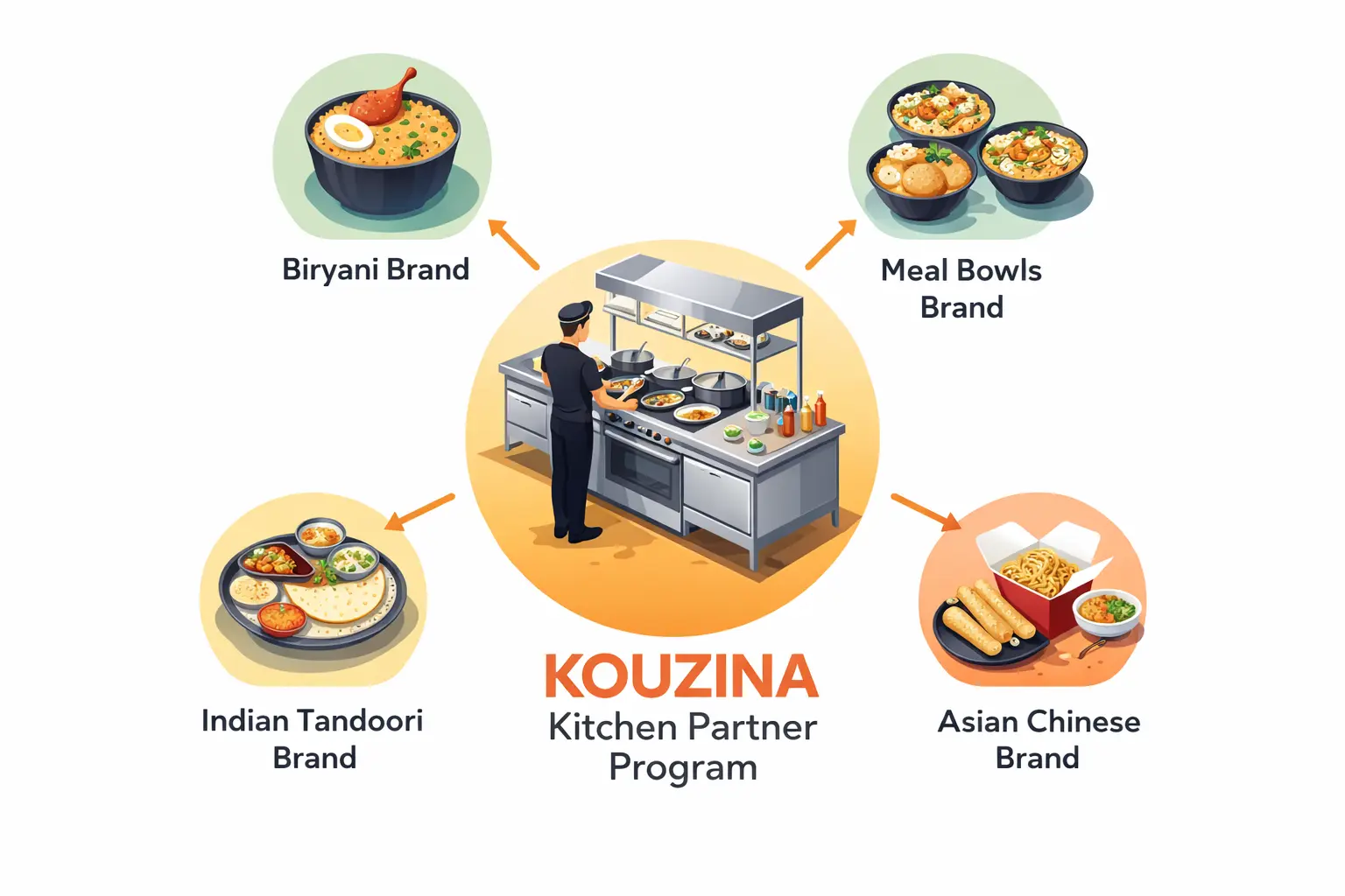 The Kouzina Kitchen Partner Program is a unique cloud kitchen partnership model that allows entrepreneurs to operate multiple established food brands from one kitchen setup.