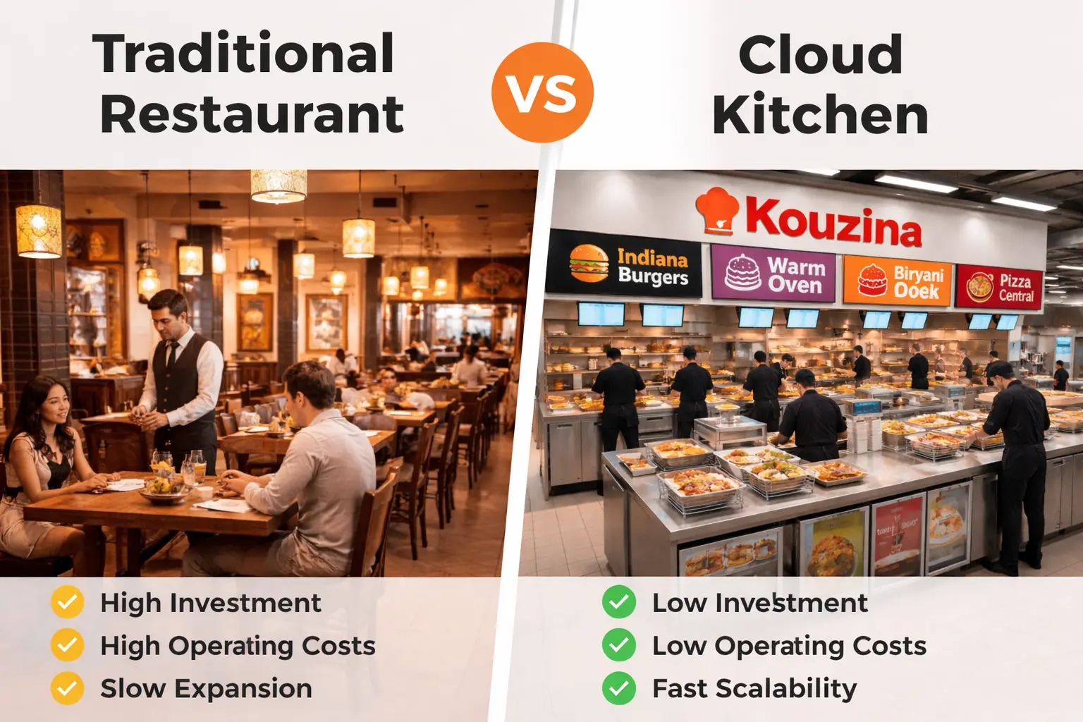 Investment: Low (Cloud Kitchen) vs High (Traditional)