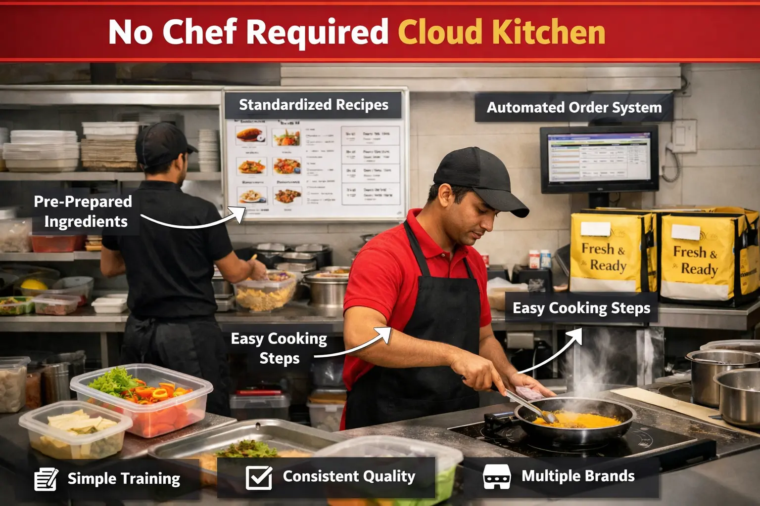 A No Chef Required Cloud Kitchen is a delivery-only kitchen that operates without a professionally trained chef. Instead, food preparation follows standardized cooking processes and pre-prepared ingredients that allow staff with minimal training to prepare dishes consistently.