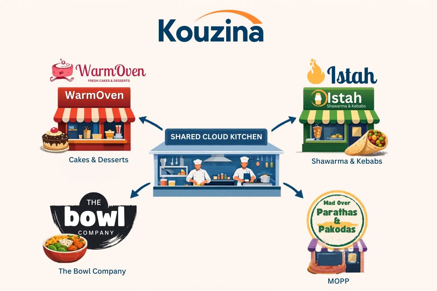 By combining strong brand identity with efficient kitchen operations, Kouzina helps entrepreneurs start and scale cloud kitchens with minimal risk.