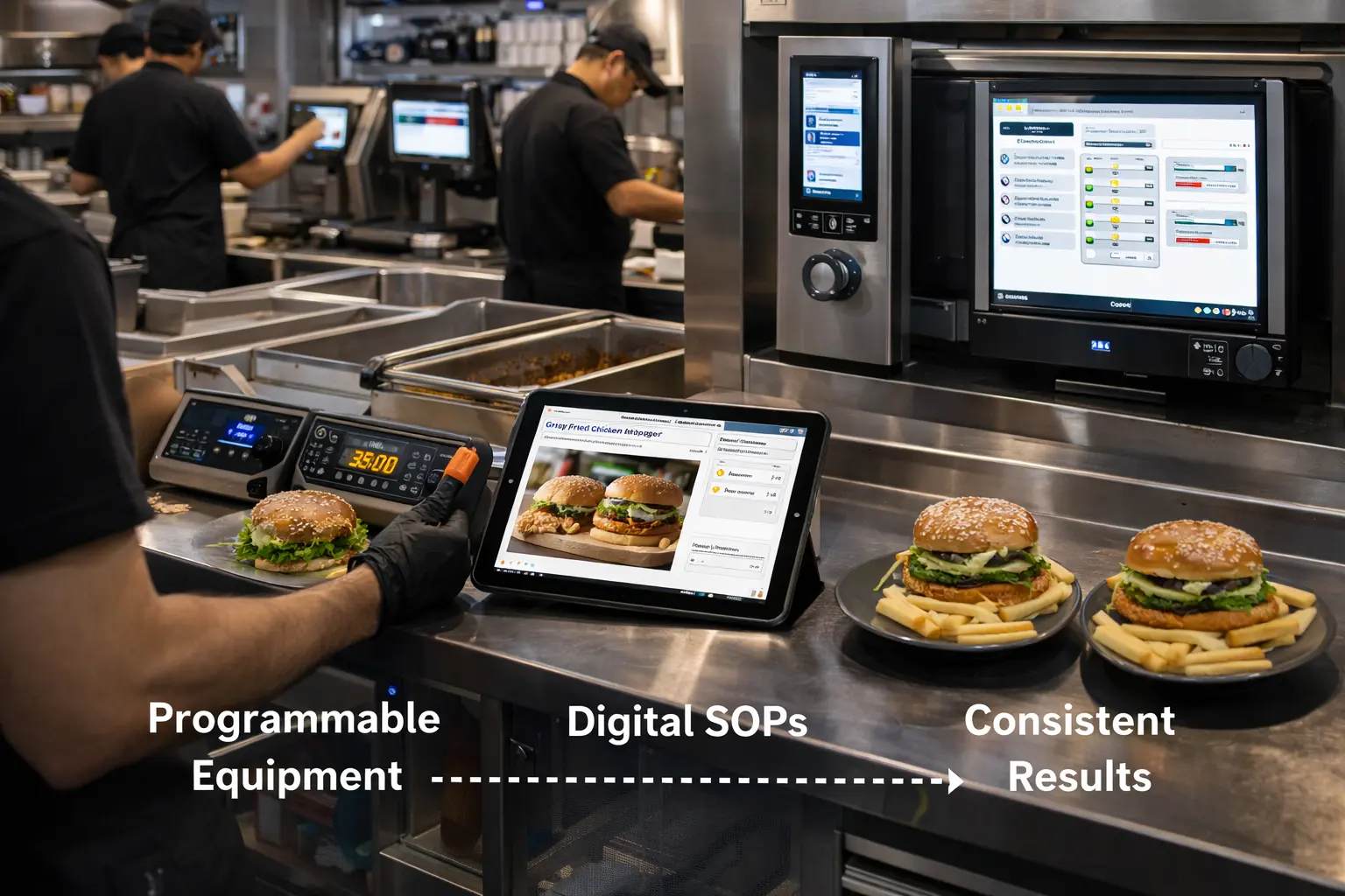 Modern ovens, fryers, and grills operate on preset digital profiles. Cooking times, temperatures, and sequences are standardized—removing human guesswork and reducing variability.