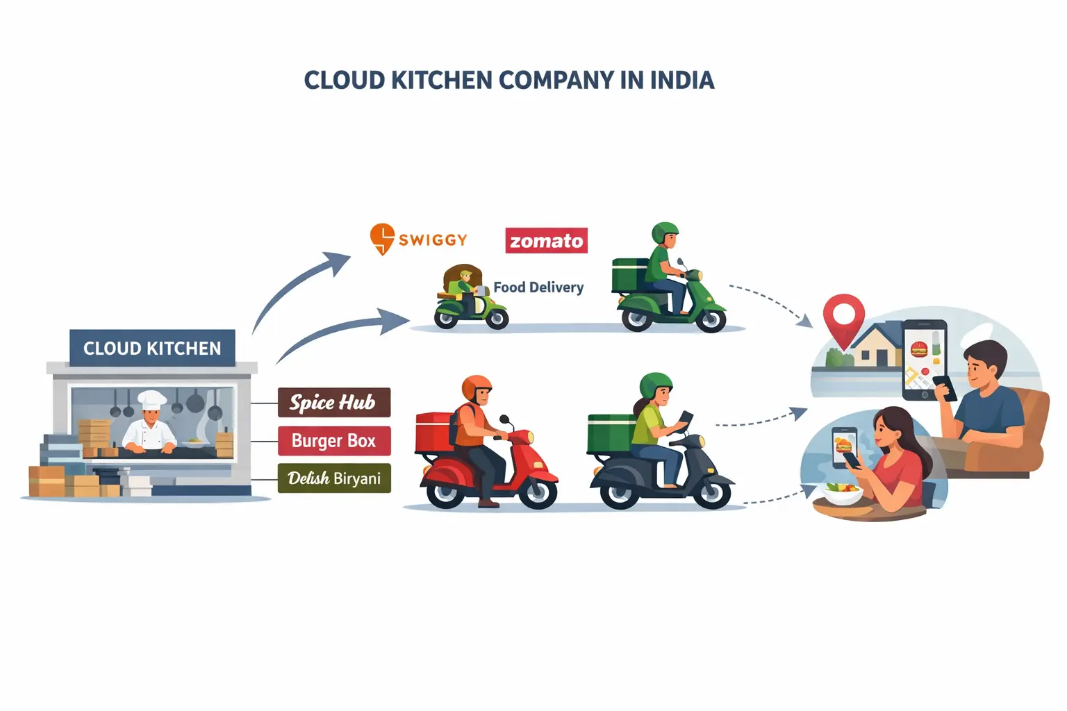 A cloud kitchen company in India is an organization that builds, operates, and manages delivery-only kitchens. These kitchens do not serve walk-in customers. Instead, they focus entirely on online food orders received through platforms like Swiggy, Zomato, and brand-owned digital channels.